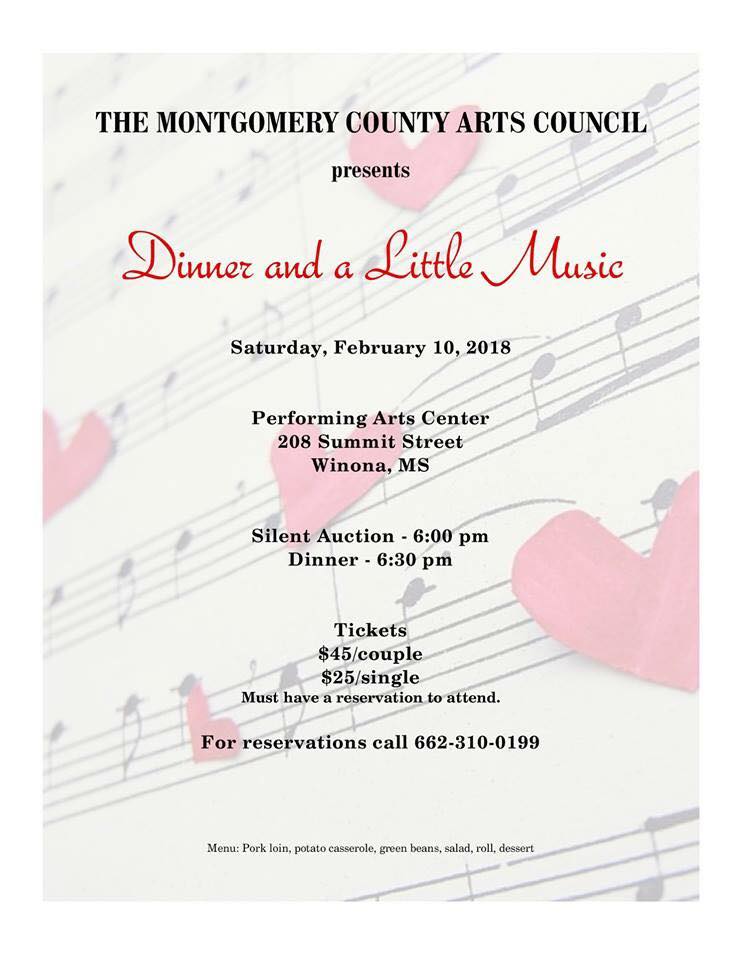 The annual Valentine Dinner Theatre sponsored by the Montgomery County Arts Council will be held on Saturday, February 10 at the Performing Arts Center, 208 Summit Street, Winona. Reservations are now being taken. Tickets are $25 each or $45 per couple. Call 662-310-0199 for reservations.